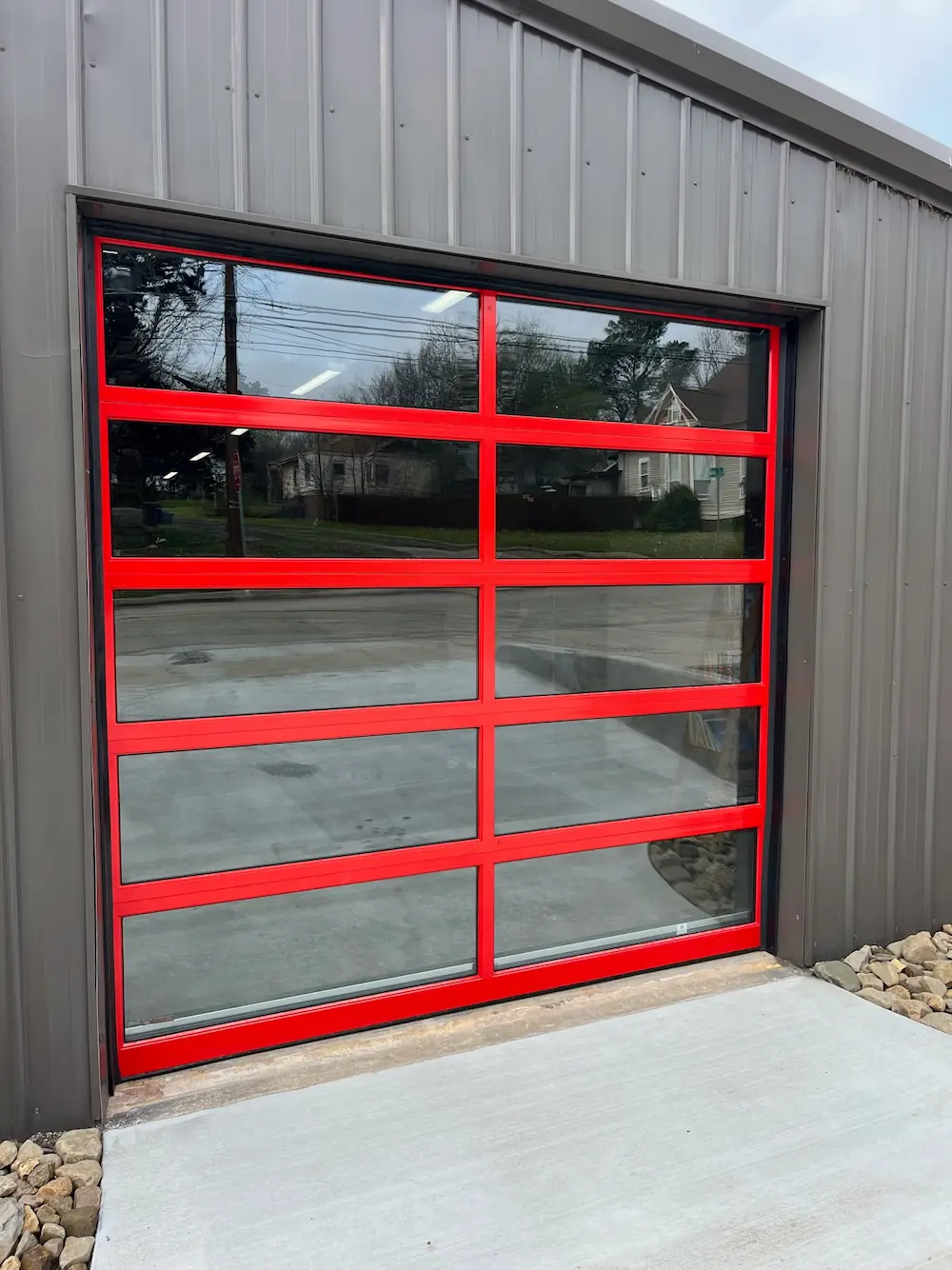 In a commercial application, a clear glass garage door allows clients to